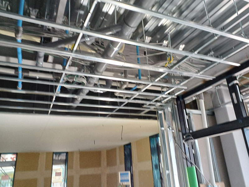店舗、オフィス、商業施設など、多くの建物で部屋を区切るために軽天工事が行われています。「軽量鉄骨」と呼ばれる材料を格子状に組んで固定し、壁や天井の下地となる骨組みをつくるのが軽天工事の役割です。建物の安全を支える重要な工事であり、施工には高い技術力が求められます。